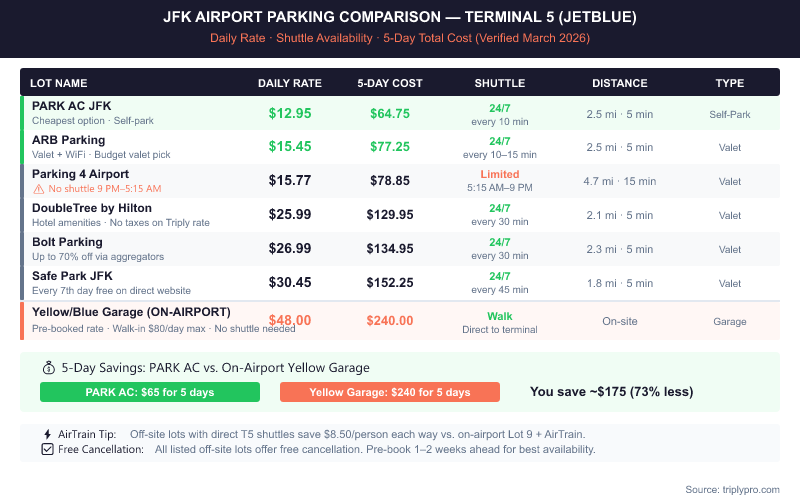Off-site lots cut costs dramatically. Based on current Triply rates (verified March 2026), you can park near JFK for as little as $12.95/day. That's a saving of over $35/day compared to the on-site daily max. For a 5-day trip, that difference adds up to more than $175.