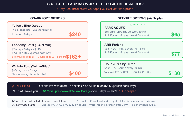Off-site parking is almost always cheaper. Here's a direct comparison for a 5-day JetBlue trip (verified March 2026):