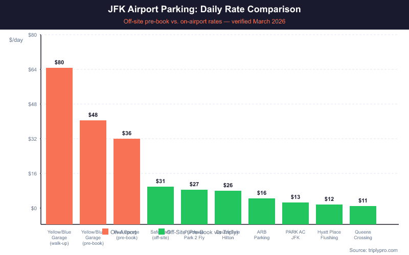 Rates verified March 2026. Off-site lots require online pre-booking — walk-up pricing is not available at most. On-airport rates sourced from JFK's official parking page.