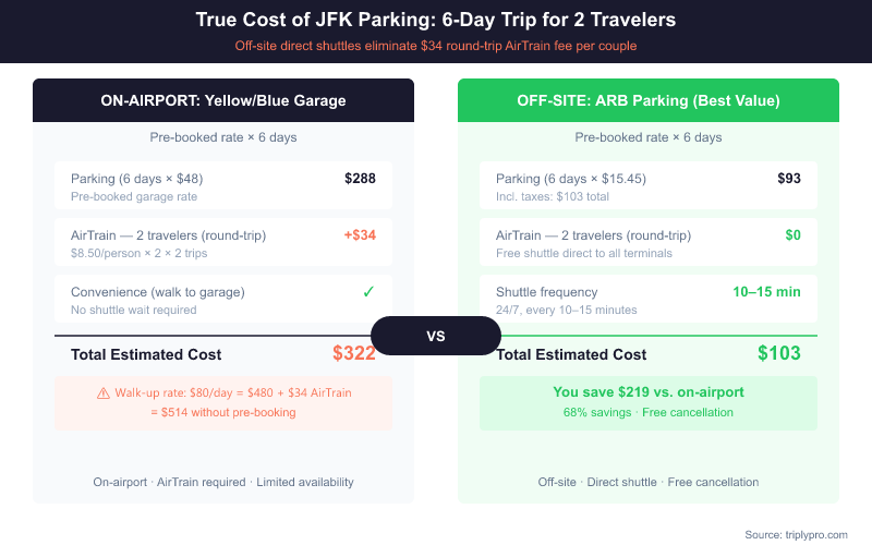 Both options let you pre-book, but the price and experience are very different. On-site parking is closer and simpler — off-site parking is cheaper and skips the AirTrain fee.