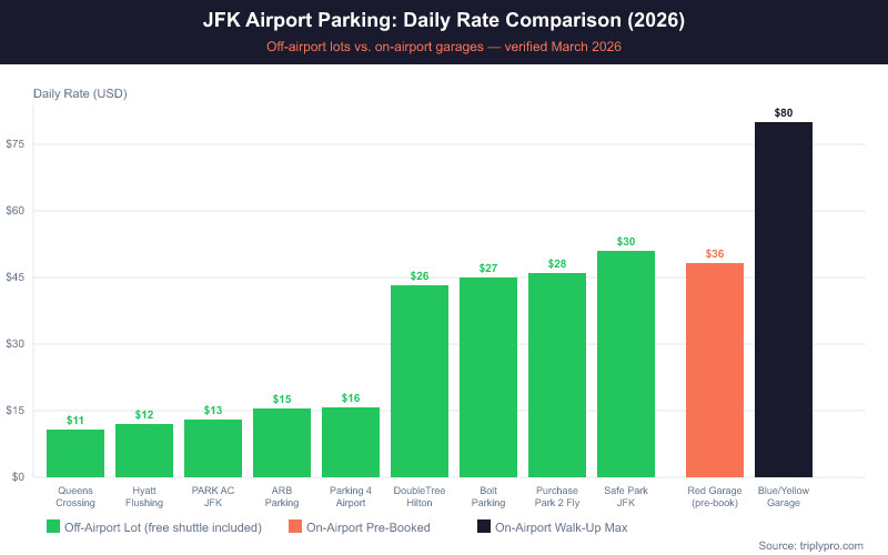 JFK parking costs vary widely. On-airport garages charge up to $80/day. Off-airport lots — where promo codes apply — range from $10.62 to $30.45/day, based on current Triply rates (verified March 2026).