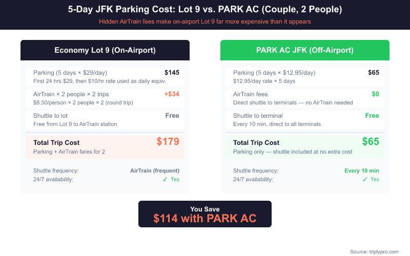 Here's a hidden cost worth knowing: the AirTrain costs $8.50 per person, one-way, according to JFK's official AirTrain page. A couple parking for 5 days at Lot 9 pays $145 in parking plus $34 in AirTrain fares — a total of $179. The same trip at PARK AC costs roughly $65, with a free shuttle included. That's a saving of over $110.