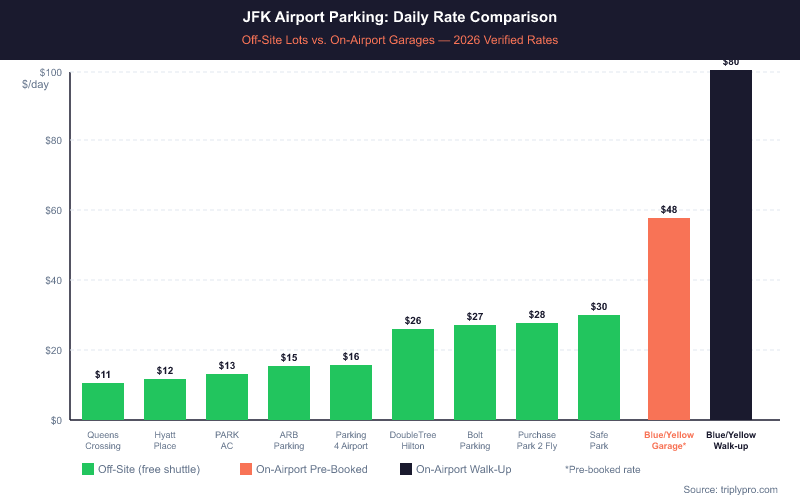 Off-site JFK parking starts at $10.62/day and tops out at $30.45/day, based on current Triply listings. On-airport garages cost significantly more. According to JFK's official parking page, the Yellow and Blue Garages charge up to $80/day walk-up, with pre-booked rates at $48/day. Off-site options save you between 55% and 87% compared to on-site garages.