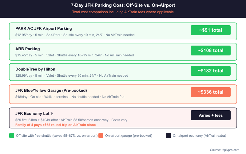 | JFK Blue Garage (pre-booked) | $48.00 | ~$336.00 | No (on-site) |