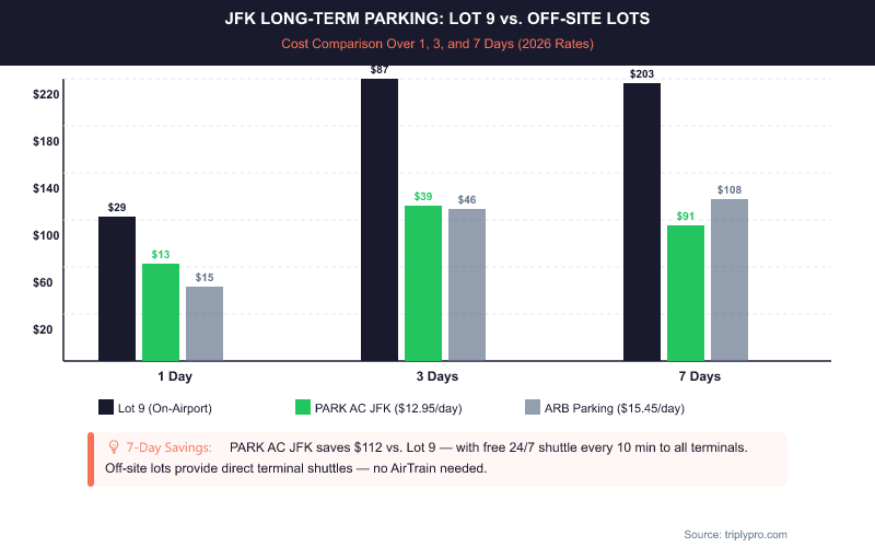 A 7-day stay at Lot 9 costs roughly $203 or more based on current Port Authority rates (verified March 2026). The same stay at PARK AC JFK runs about $91. That's over $110 in savings. Always confirm rates on JFK's official parking page before you book, as rates can change.