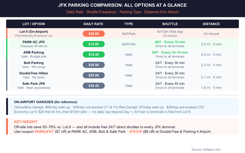 For travelers flying from Terminal 4 (Delta, Emirates, Singapore Airlines) or Terminal 5 (JetBlue), off-site lots with direct shuttles can also be faster than waiting for the AirTrain loop. Rates verified March 2026.