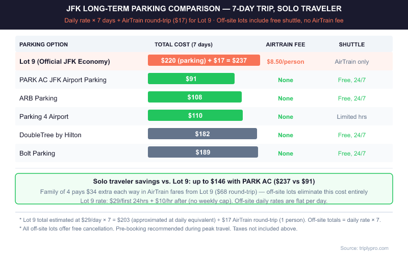 Off-site private lots available through Triply start at $12.95/day for JFK-specific lots. For a 7-day trip, the savings can be significant. Here's a verified pricing comparison (as of 2026):