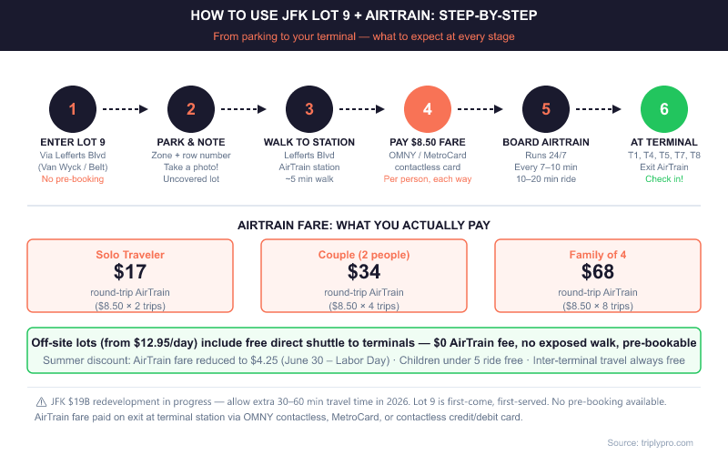 - AirTrain fare is $8.50 per person each way — a family of four pays $34 extra per direction just to reach their terminal from Lot 9.