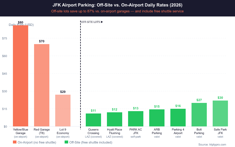 On-airport garages charge up to $80/day at the Yellow and Blue Garages, according to JFK's official parking page. Even the most expensive off-site lot at $30.45/day saves you roughly 62% versus on-airport rates. Groupon deals may shave a few more dollars off. But a direct promo code like PARKJFK7 often delivers equal or better savings — without Groupon's refund complications.