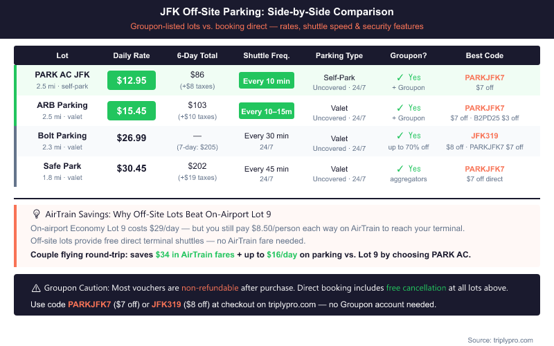 - Direct promo codes like PARKJFK7 ($7 off) often match or beat Groupon prices without the refund risk.