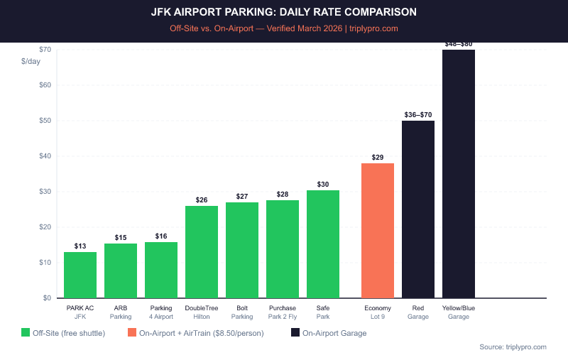 Off-site lots serving Howard Beach and JFK charge $12.95 to $30.45 per day, based on verified Triply rates as of March 2026. That's far less than on-airport options, which run up to $80/day at the Yellow and Blue Garages.