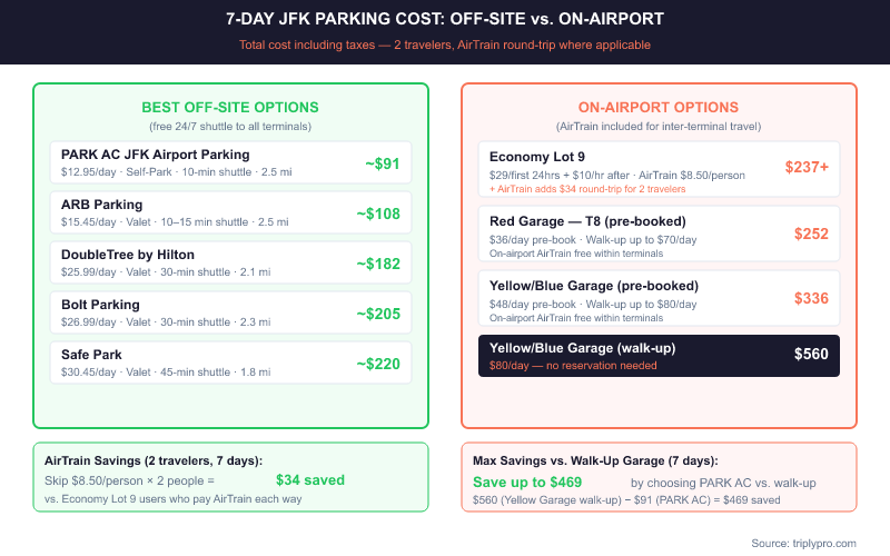 For a 7-day trip, parking at PARK AC JFK costs around $90.65. The same trip at the Yellow Garage walk-up rate costs up to $560. That's a saving of nearly $470 per week. Several lots also offer promo codes — see our guide to JFK long term parking promo codes for current deals.