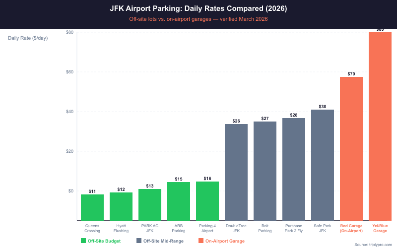 JFK long-term parking prices range from $10.62/day at off-site lots to $80/day at on-airport garages. The cheapest verified option is Queens Crossing – LAZ Parking at $10.62/day, though its shuttle stops at 10:30 PM. For 24/7 access, PARK AC JFK Airport Parking at $12.95/day is the best budget pick, with free shuttles every 10 minutes. On-airport Economy Lot 9 costs $29 for the first 24 hours, then $10/hour — making it a poor choice for multi-day trips. Pre-booking on-airport garages can cut rates by up to 49%, based on current 2026 pricing data.