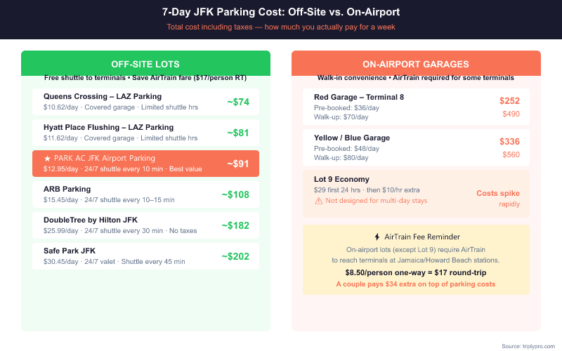 Pre-booking on-airport garages does close the gap. The Red Garage at $36/day pre-booked is competitive with some off-site options. But you still pay the $8.50 AirTrain fare each way — that's $17 round-trip per person on top of parking costs.