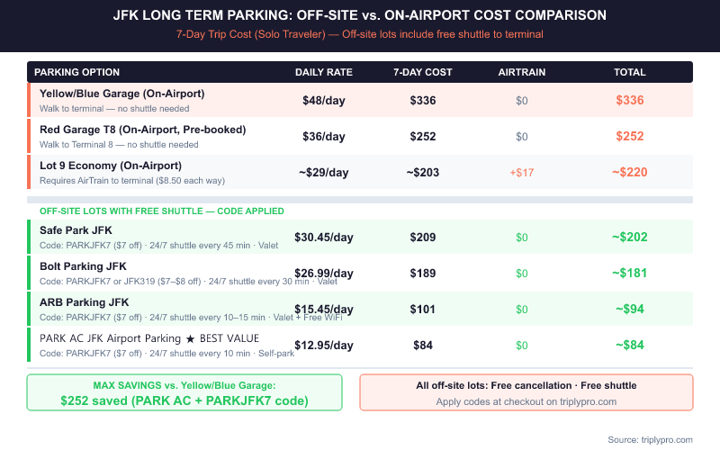 Here's a full pricing comparison across verified JFK off-site lots, including active promo codes (verified March 2026):