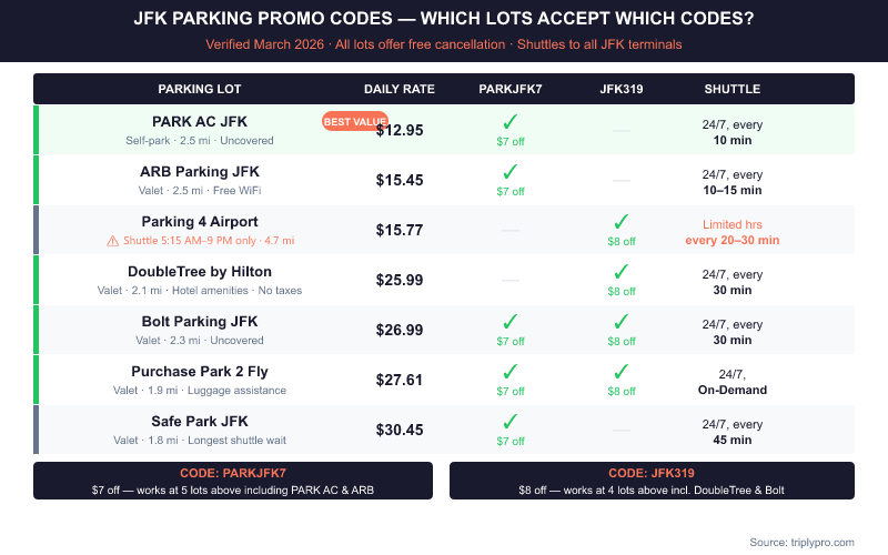 - Top active codes: PARKJFK7 saves $7 off at PARK AC, ARB Parking, Bolt Parking, Purchase Park 2 Fly, and Safe Park. JFK319 saves $8 off at Parking 4 Airport, DoubleTree by Hilton, Bolt Parking, and Purchase Park 2 Fly (verified March 2026).
