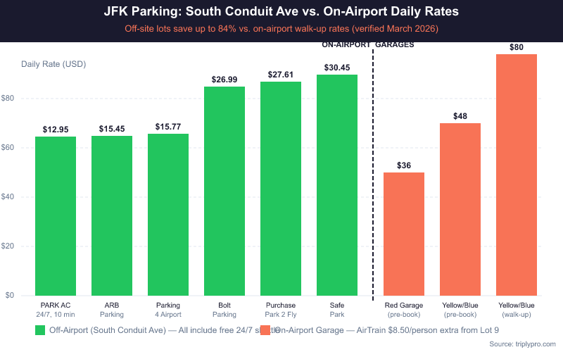 Several verified lots operate on or directly off South Conduit Ave and serve JFK Airport. Rates below are based on current Triply data (verified March 2026).