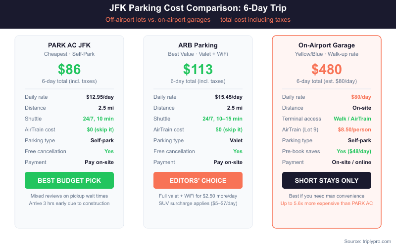 | PARK AC JFK Airport Parking | $12.95/day | ~5 min | 24/7, every 10 min | Self-park (uncovered) |