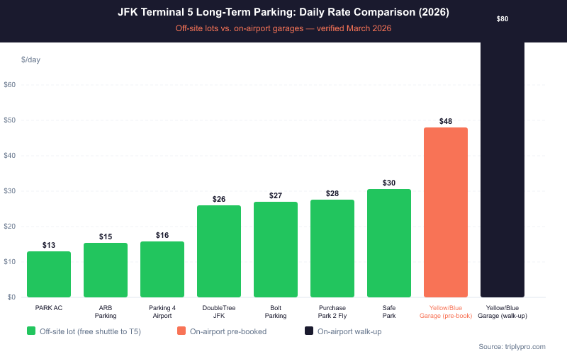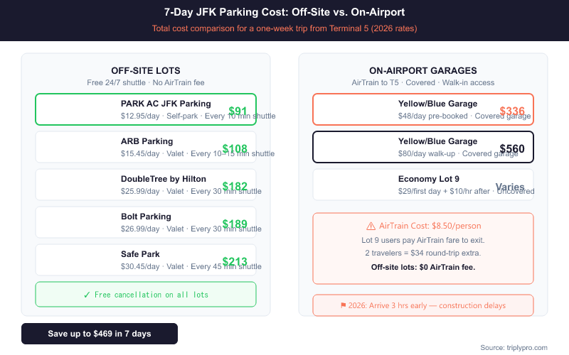 - Cheapest off-site option: PARK AC JFK Airport Parking at $12.95/day, about 5 minutes from the airport with a free shuttle every 10 minutes (verified March 2026)