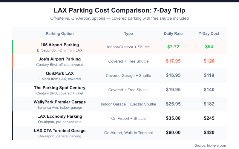 - Base rate: $17.95/day at Joe's Airport Parking LAX (verified April 2026)