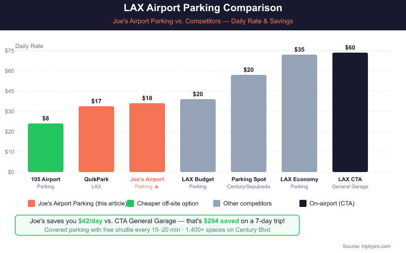 If you need the absolute lowest daily rate near LAX, see our full breakdown of LAX airport parking rates per day, which compares every on-site and off-site option.