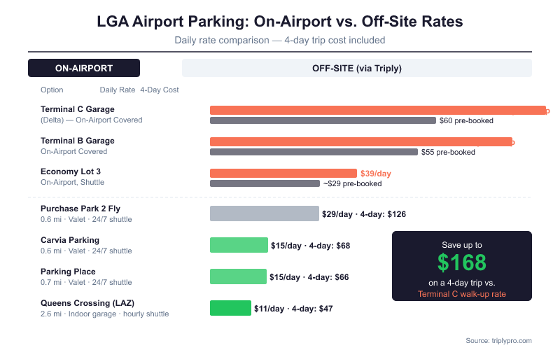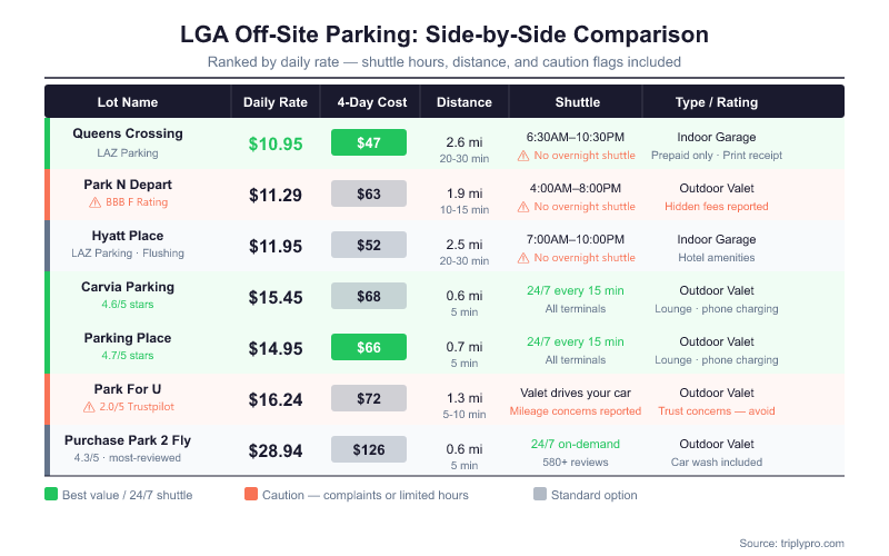 - Compare options on Triply. Search LGA parking on Triply to see all verified off-site lots side by side — with shuttle schedules, amenities, and live pricing.