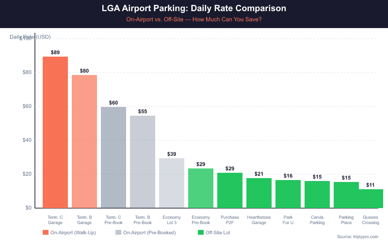 - Compare off-site and on-site options side by side — use Triply's LGA parking search to see verified real-time rates across all lots