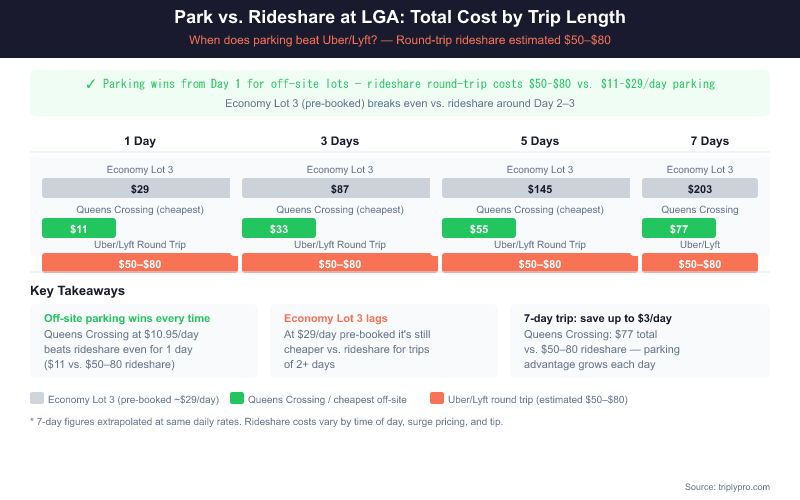 | Trip Length | Economy Lot 3 (pre-booked) | Cheapest Off-Site (Queens Crossing) | Uber/Lyft Round Trip (est.) |