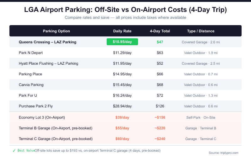 Off-site lots through Triply range from $10.95/day to $28.94/day across nine verified lots. That's a savings of up to 86% versus the Terminal C Garage. For a 7-day trip, that difference adds up to over $500 in some cases. For a full breakdown of on-airport and off-site pricing, see our guide on LaGuardia airport parking cost.