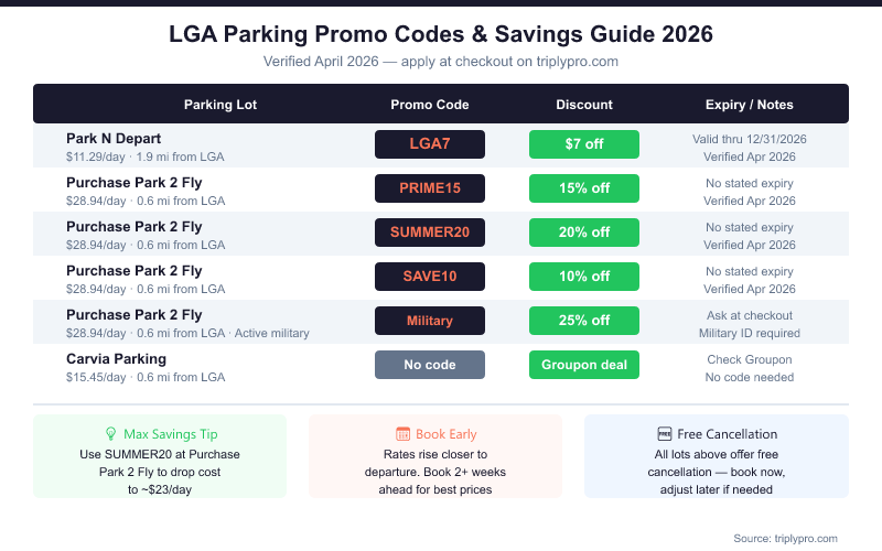 | Park N Depart (LGA) | LGA7 | $7 off total | Valid through 12/31/2026 (verified April 2026) |