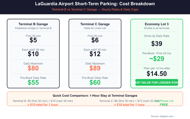 Short-term parking at LaGuardia starts at $5 for 30 minutes at Terminal B and $6 at Terminal C, with daily caps of $80 and $89. Pre-booking saves up to $29/day. Free Cell Phone Lot available.