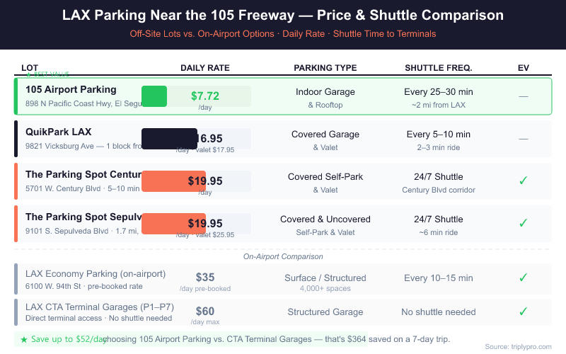 Off-site parking near the 105 freeway ranges from $7.72/day to $31.95/day across verified lots — compared to $35/day for LAX Economy Parking and $60/day for on-airport CTA garages. The table below shows current rates for every major lot (verified April 2026).