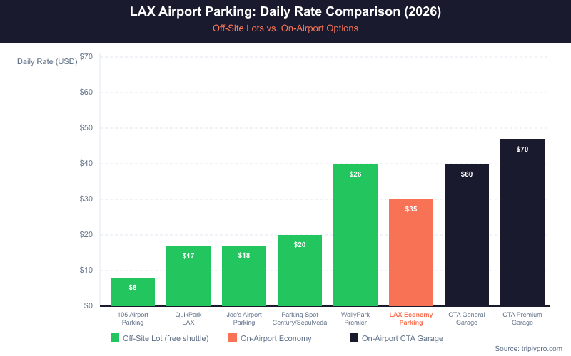 LAX parking costs vary widely depending on lot type and how far in advance you book. Based on current rates, off-site lots cost up to 87% less per day than on-airport CTA garages. Here's a full comparison (verified April 2026):