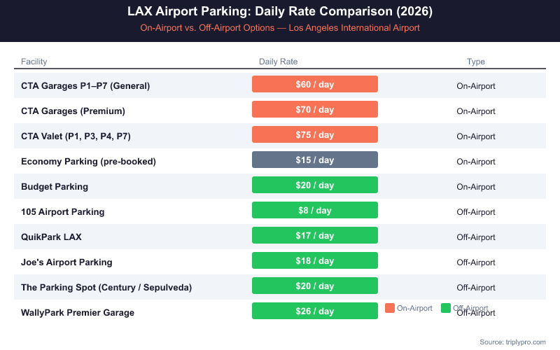 LAX parking rates vary significantly depending on which facility you choose. On-airport garages are the most convenient but also the most expensive. Off-site lots offer the best value for trips longer than one day. Here's a full breakdown of current rates (verified April 2026):