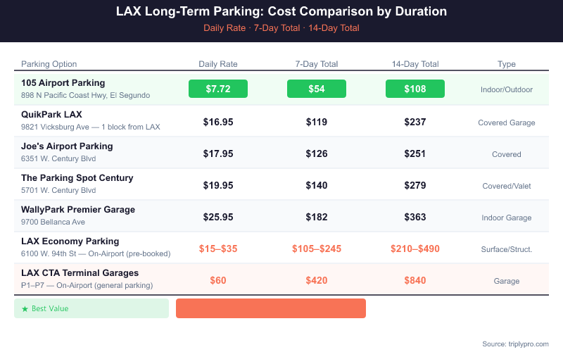 Ready to book? Compare all verified LAX long term parking options on Triply — rates from $7.72/day with free cancellation on most lots.