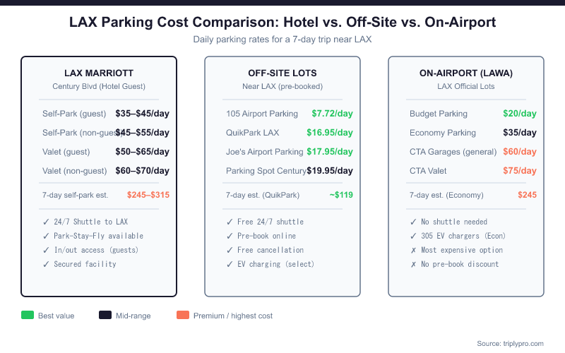 Before committing to Marriott LAX parking, compare LAX parking rates from $7.72/day on Triply — you may find off-site lots with faster shuttles and lower daily rates that work better for your trip.