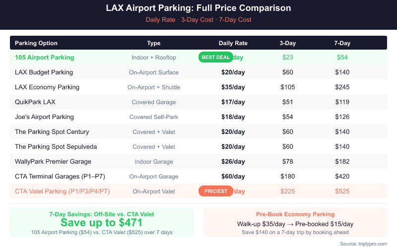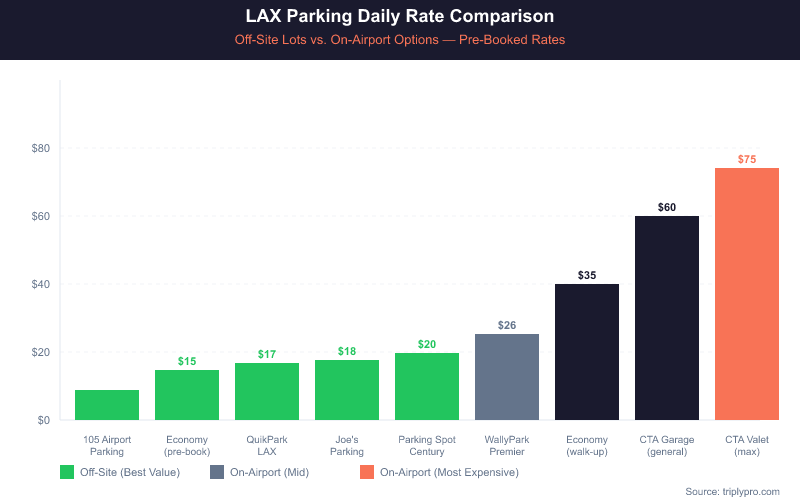 LAX parking costs depend on three things: the lot you choose, how long you stay, and whether you book in advance. On-airport options, managed by Los Angeles World Airports (LAWA), set the price ceiling. Off-site lots near Century Boulevard and Sepulveda Boulevard offer the lowest daily rates. Based on current rates verified April 2026, you can pay anywhere from $7.72/day (105 Airport Parking) to $75/day (CTA valet) — a difference of over 870%.