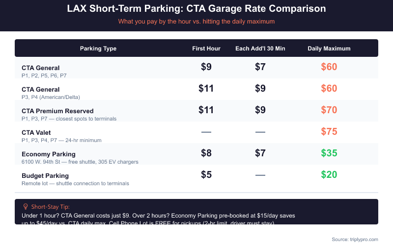 LAX airport parking short term uses CTA garages P1–P7 attached to each terminal. Rates start at $9/hr and cap at $60/day. Here's what to know before you park.