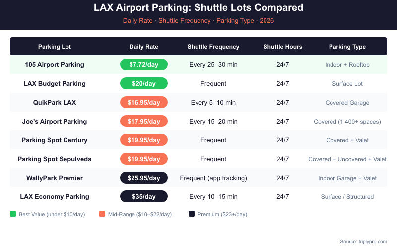 - Shuttle frequency ranges from every 5-10 minutes (QuikPark LAX) to every 25-30 minutes (105 Airport Parking).