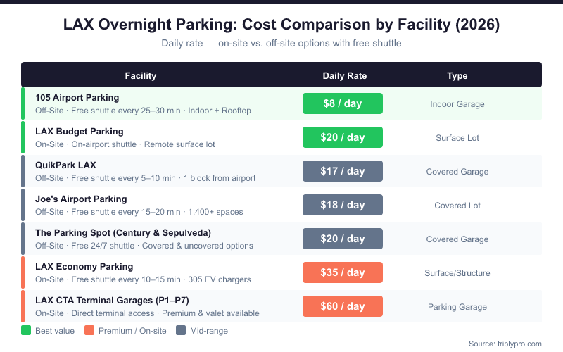 - Best on-airport overnight rate: LAX Budget Parking at $20/day — drive-up lot, no reservation needed