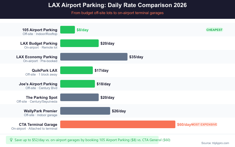 LAX car parking rates are the daily or hourly fees charged to drivers who leave their vehicle at Los Angeles International Airport — either in on-airport structures managed by Los Angeles World Airports (LAWA) or at private off-site lots nearby. Rates range from $7.72/day at 105 Airport Parking up to $75/day for on-airport valet, with a wide range of options in between depending on your terminal, trip length, and how much comfort you want.
