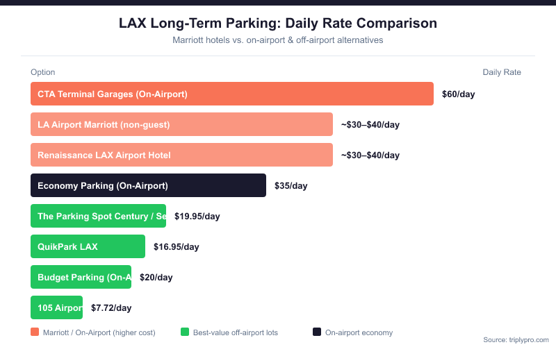 - LAX Economy Parking: $35/day with a free shuttle every 10–15 minutes. Slightly cheaper than Marriott non-guest rates for pure parking.