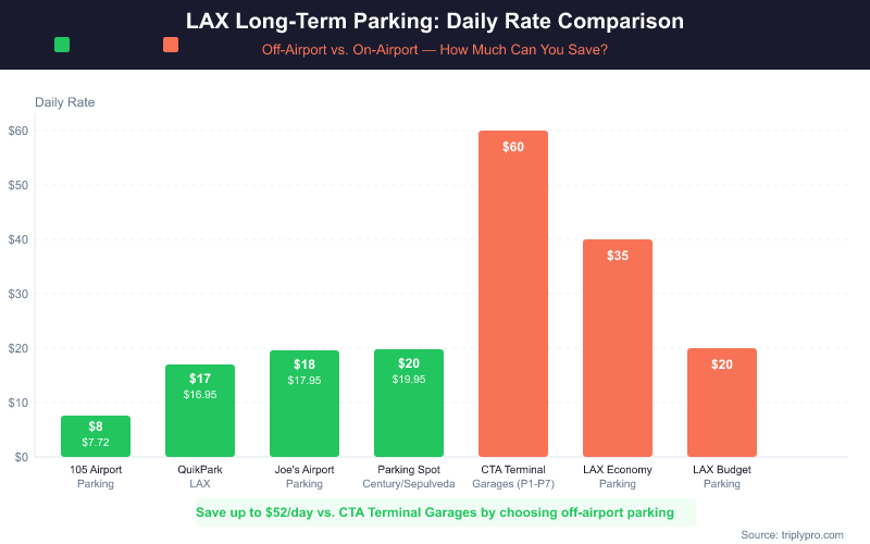 LAX long-term parking costs range from $20/day at the official Budget Lot to $60/day at the CTA terminal garages, per Los Angeles World Airports (LAWA). Off-airport options run significantly cheaper, from $7.72 to $31.95/day (verified April 2026).