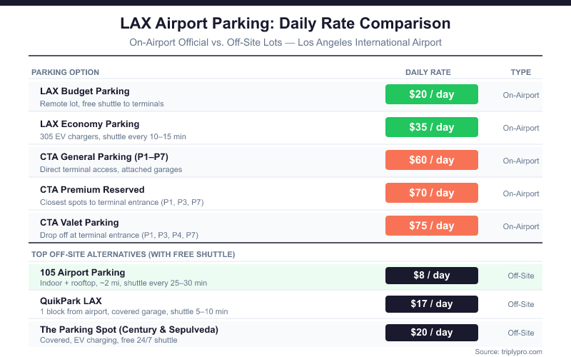 Platforms like Triply, SpotHero, and Way.com aggregate rates from multiple LAX lots in one place. You can sort by price, shuttle time, and amenities. This is the fastest way to confirm you're getting the best rate available on your specific travel dates.