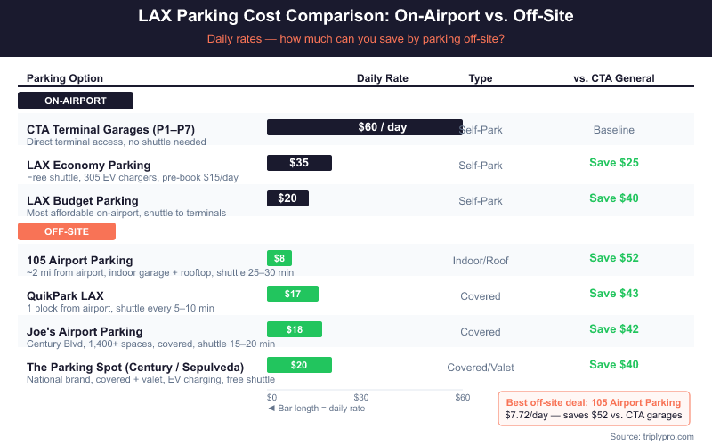 Off-site lots range from $7.72 to $31.95/day. Even the most expensive off-site option — WallyPark Express at $31.95/day — costs 47% less than the standard CTA terminal garage rate. For a full breakdown by daily and hourly charges, see our LAX airport parking rates per day guide.