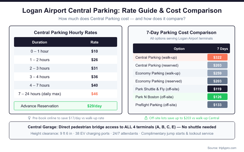 For a full breakdown of how Central Parking costs compare to every other option at BOS, see our guide to Logan Airport parking costs and the full 2026 rate breakdown.