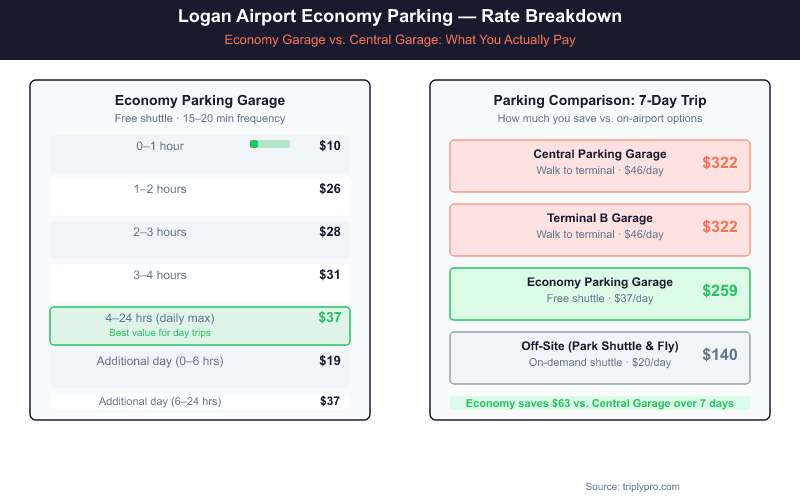 Logan Airport Economy Parking is the most affordable on-airport parking option at Boston Logan International Airport, located in a dedicated garage off Route 1A in East Boston. The lot charges a maximum of $37/day — compared to $46/day at the Central Parking Garage — and connects to all four terminals via a free shuttle bus. If you know how to get there and how the shuttle works, it's one of the best budget moves at BOS.