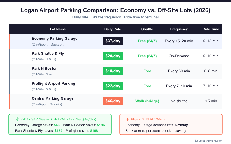 Prefer covered parking and frequent shuttle service? Preflight Airport Parking runs a shuttle every 7-10 minutes with real-time tracking at $22/day — faster than the Economy Garage and nearly $15/day cheaper. See a full breakdown of your off-site choices in our Logan Airport off-site parking guide.