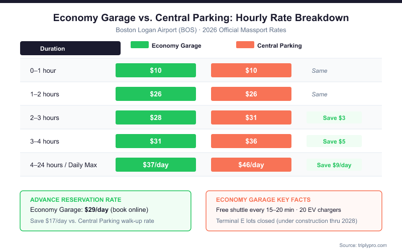 The Logan Airport Economy Parking shuttle is a free, 24/7 bus service run by Massport that connects the Economy Parking Garage to all four Logan terminals — A, B, C, and E. The shuttle runs every 15-20 minutes and is included in your parking fee. At $37/day, Economy Parking is Logan's most affordable on-airport option — $9/day cheaper than the Central Parking Garage at $46/day (verified April 2026, per Massport's official parking page).