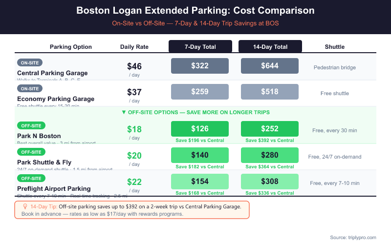 All rates are verified as of April 2026. On-airport rates are per Massport's published schedule. A 7-day stay at Park N Boston costs $126 vs $322 at the Central Parking Garage — a savings of $196, or roughly 61%. Over 14 days, that gap grows to $392 in savings. For more detail on how daily rates compound over longer trips, see our full breakdown of Boston Logan long-term parking costs.